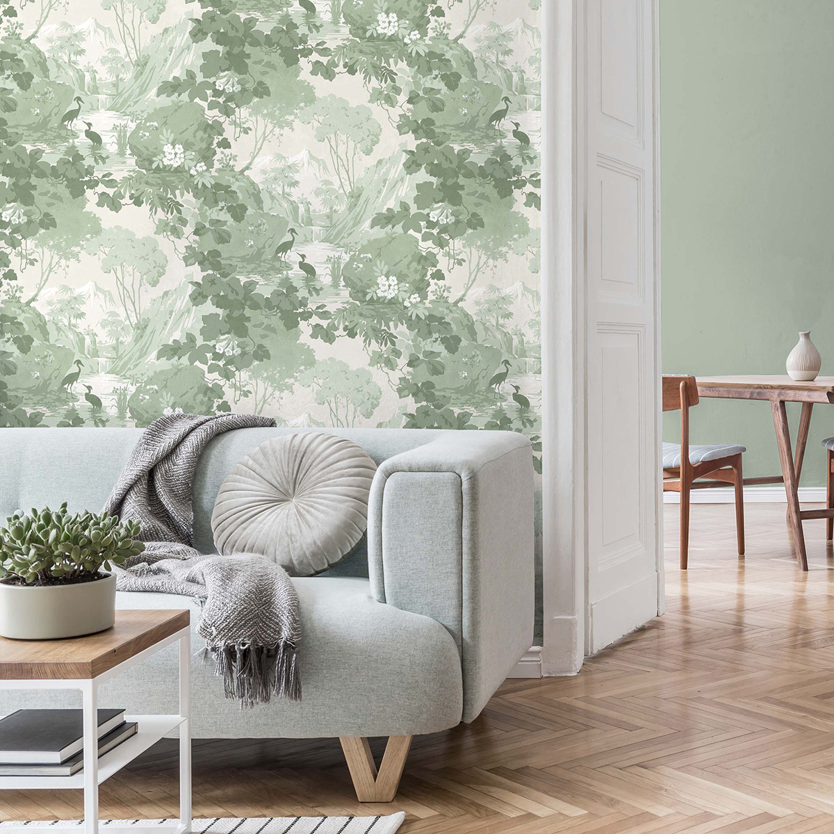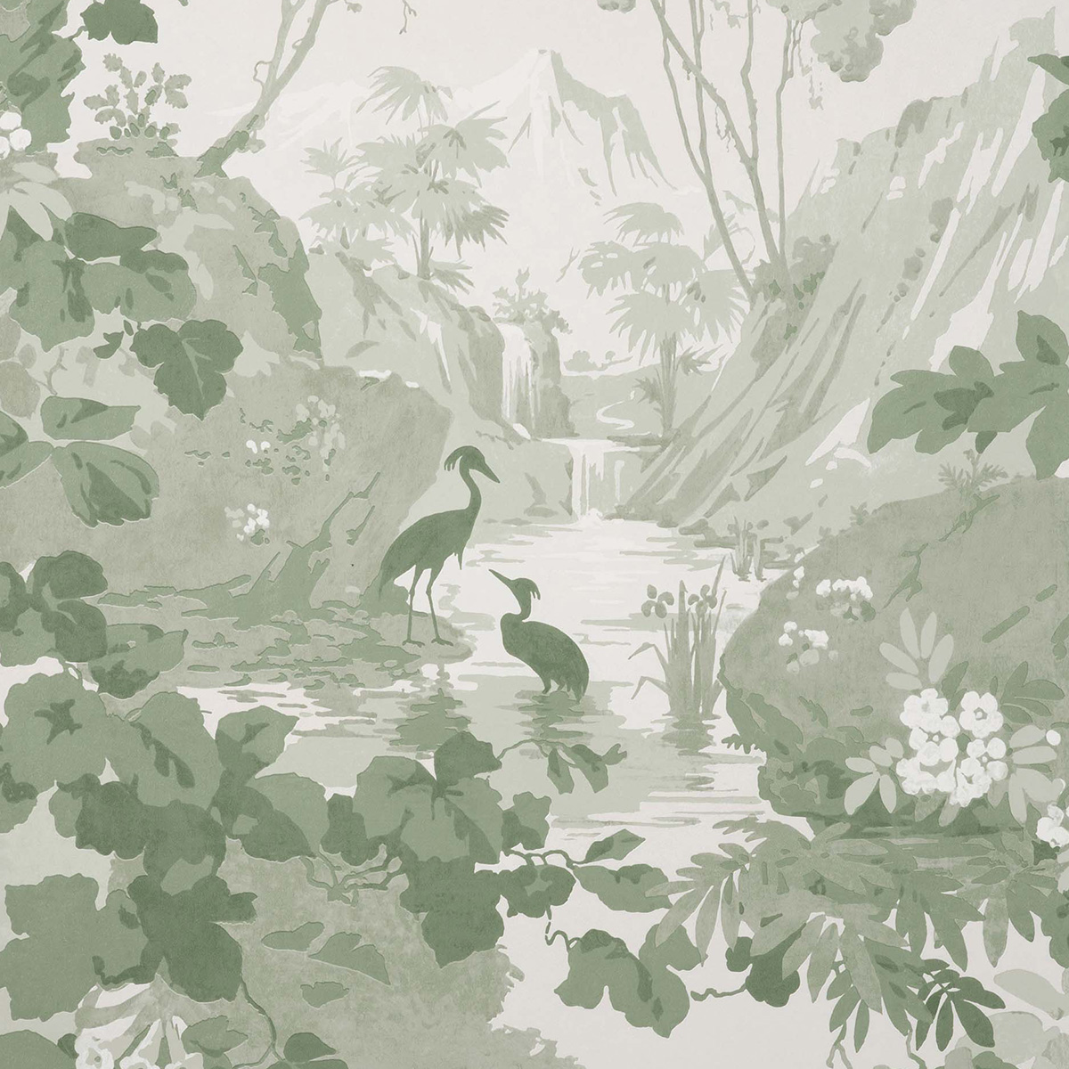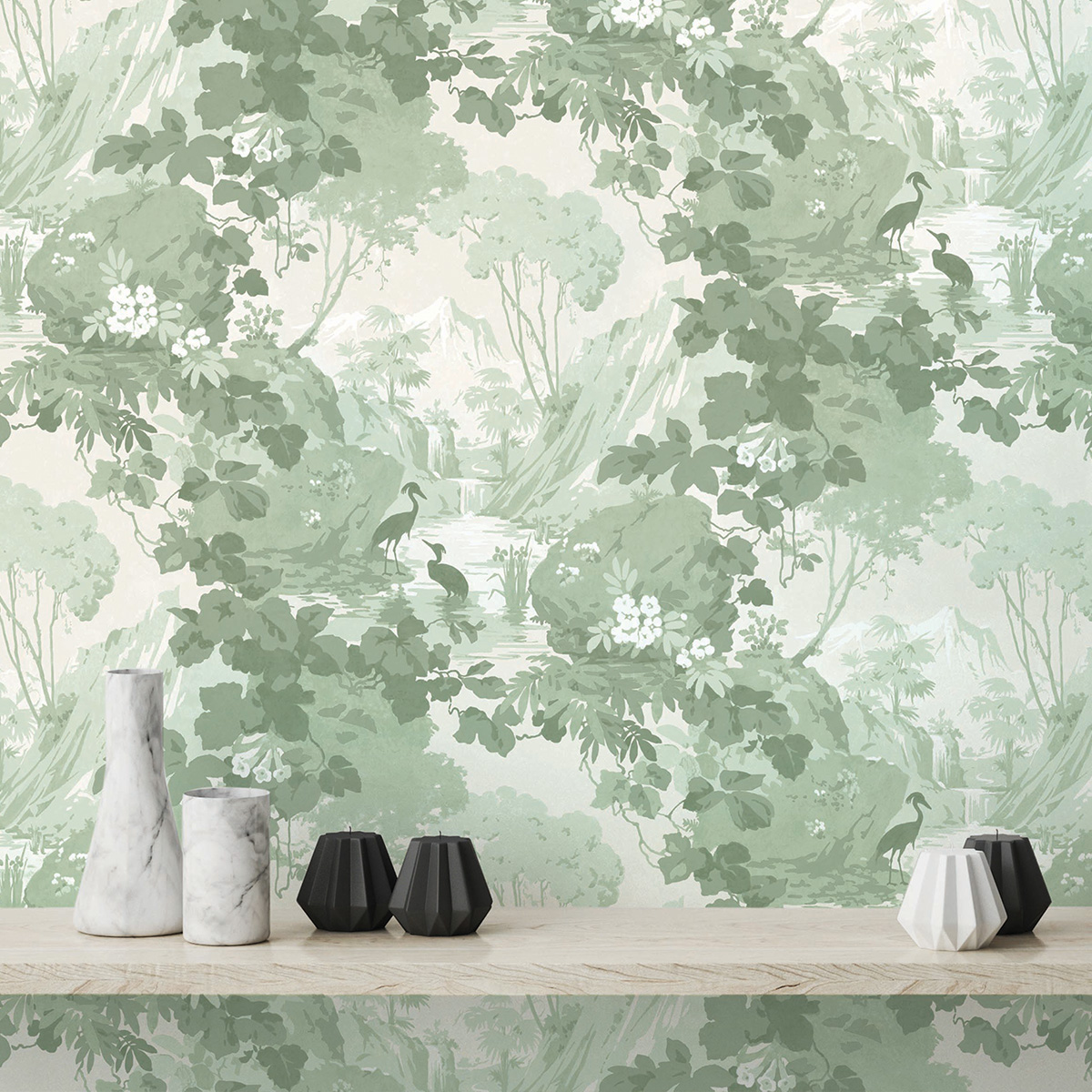 Атмосферный восточный пейзаж с живописными горами, водопадами, листьями и птицами очень точно передает гармонию и безмятежность, напоминающую зрителю о красоте природы. Гармоничные цветовые сочетания подчеркивают сюжет райского сада и привносят в интерьер дух аристократизма.