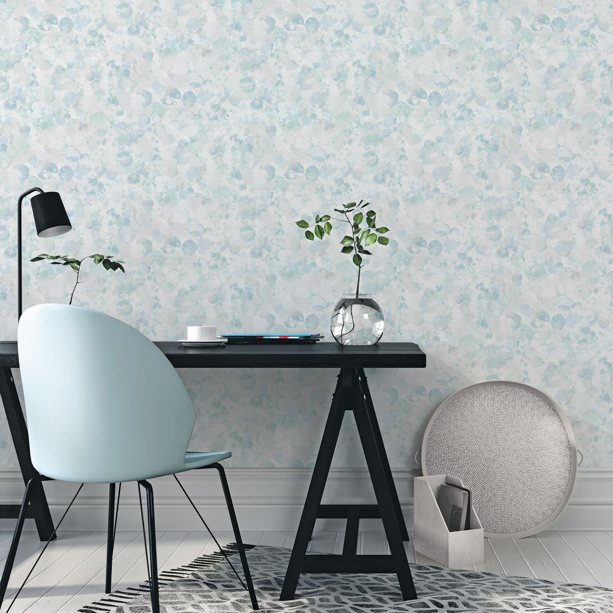 Абстрактные вариации на тему воздушных пузырьков в спокойной цветовой гамме наполняют пространство и создают современную перспективу для геометрических узоров. Рисунок дополнен текстурным перламутровым эффектом.