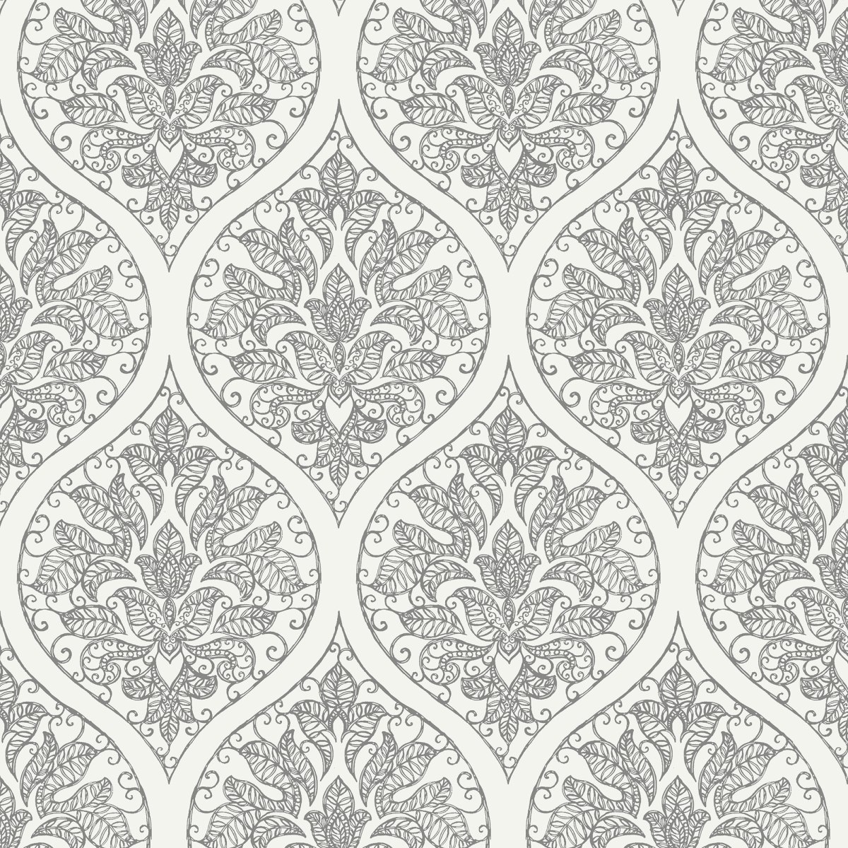 Старинный узор Ogee в монохромном исполнении металлизированными красками - невероятно легкий и художественный. Форма Ogee рисует естественный каркас с растительным узором внутри в заданном ритме.
