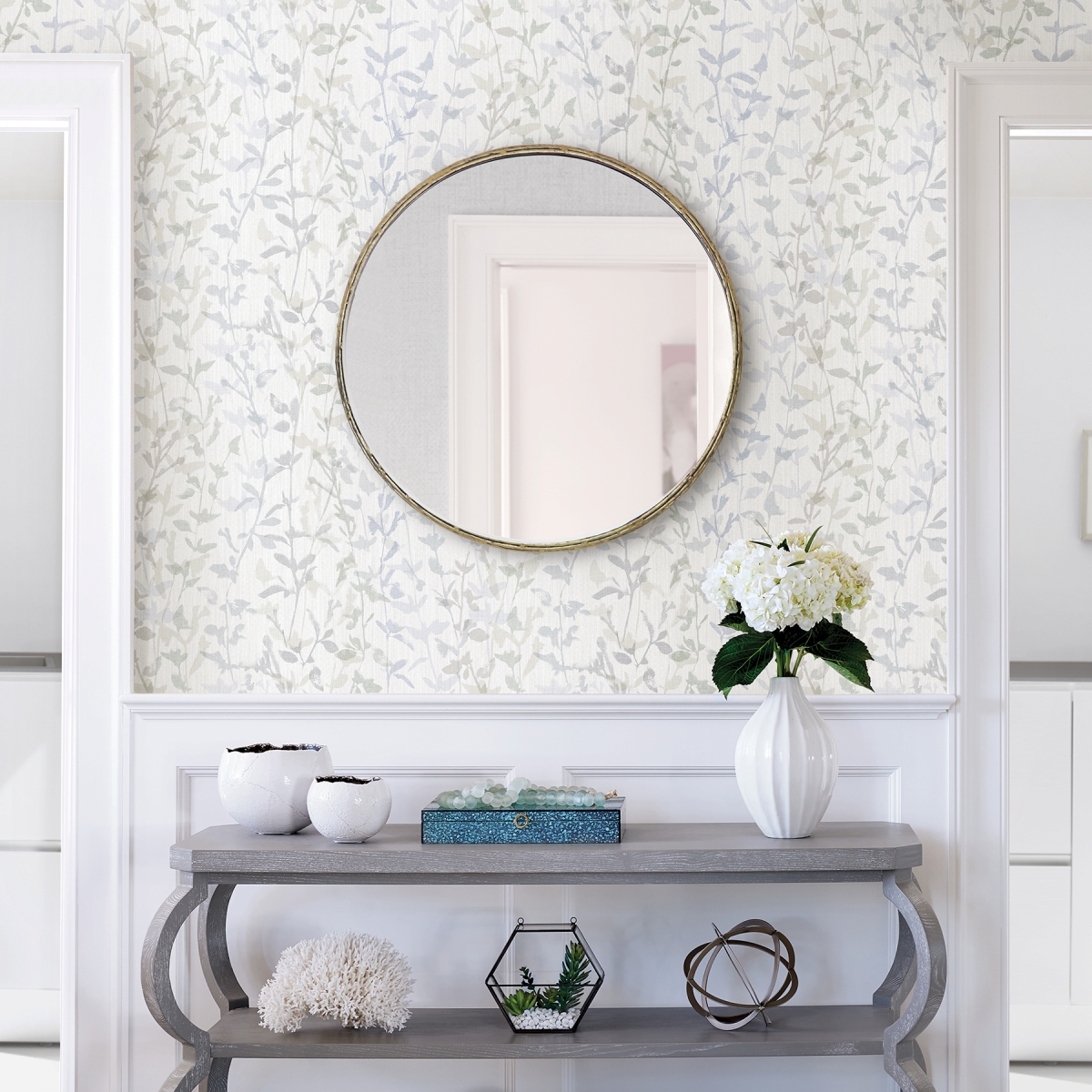 Коллекция призвана привнести комфорт в любое помещение вашего дома - от ванной до спальни. Каталог включает 14 изысканных дизайнов обоев, выполненных в сбалансированной нейтральной цветовой гамме с акцентами на серо-зеленые и угольные оттенки, от растений до геометрических фигур и текстур. Некоторые принты привносят свежий взгляд на такие классические узоры, как шеврон, а другие - на утонченный богемный стиль. Идея коллекции - удовлетворить предпочтения каждого. В коллекции используется сочетание дизайнов, текстур и цветов таким образом, чтобы помещения выглядели красиво и захватывающе. Каждый артикул отражает уникальный стиль Scott Living - это сочетание семейной реликвии, индустриальной и современной эстетики. Успокаивающий и безмятежный растительный дизайн. Льняная текстурная основа и уточненный рисунок придадут нежности и воздушности пространству. Предлагаемая цветовая гамма рисунка, создающего вертикальную изгородь, в бежево-сером, бирюзово-голубом и сине-голубом добавляет успокаивающей энергии и безмятежности.