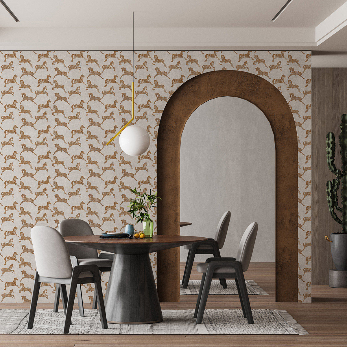 Гармония человека и лошади проверена временем, именно это животное внесло большой вклад в развитие цивилизации. Дизайн представлен с более или менее плотным повтором монохромных образов лошадей и дополнен однотонными паттернами.