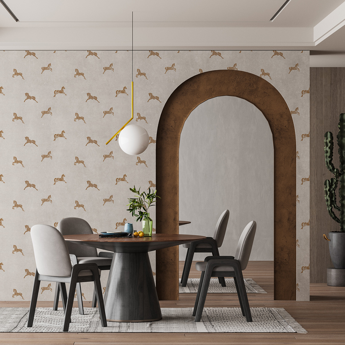 Гармония человека и лошади проверена временем, именно это животное внесло большой вклад в развитие цивилизации. Дизайн представлен с более или менее плотным повтором монохромных образов лошадей и дополнен однотонными паттернами.