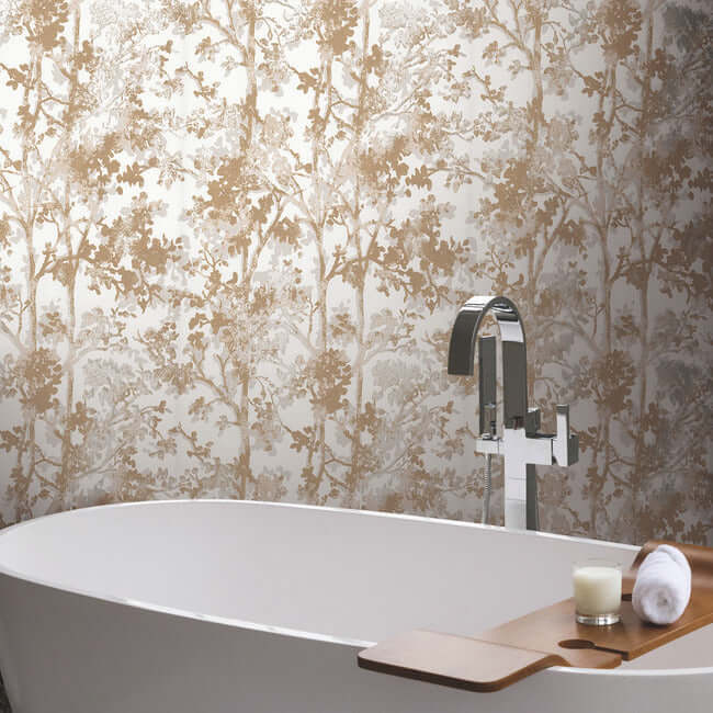 Сияющая Листва — это узор, в котором палитра различных сочетаний драгоценных металлов превращает обычные деревья в завораживающую таинственную рощу. Дизайн представлен в оттенках алебастра с мерцающими акцентами латуни и золота.