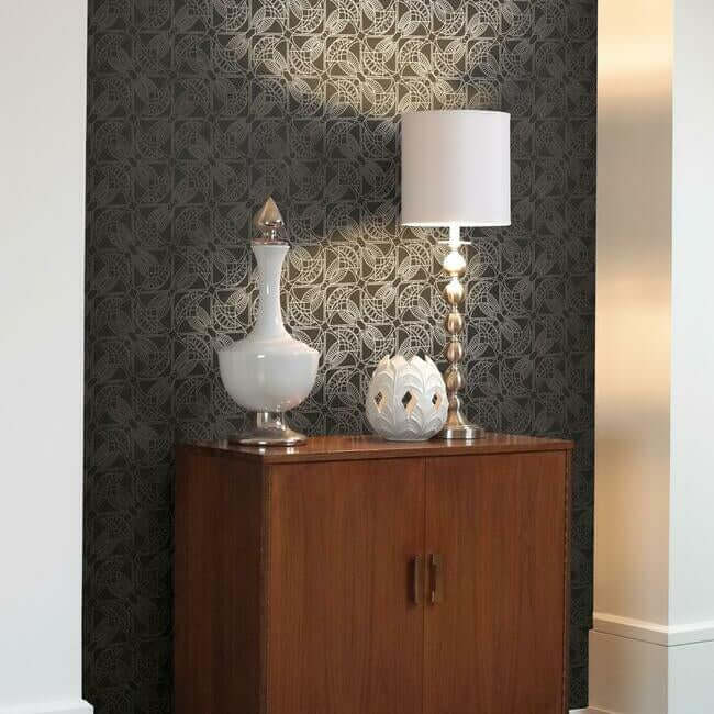 Вдохновлённые искусством Древнего Египта, обои «Cartouche» от Антонины Веллы — это современный дизайн, где над лаконичным фоном переплетаются изящные линии с мерцающим металлическим блеском.