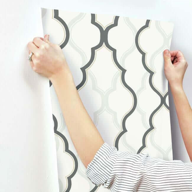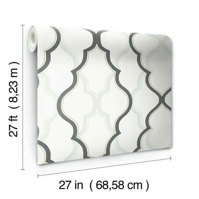 Крупный, смелый узор с арабесками и металлическим кружевом на переднем плане; мягкие тени повторяют рисунок на фоне. Это «Двойной Алмаз» — эффектные современные обои.