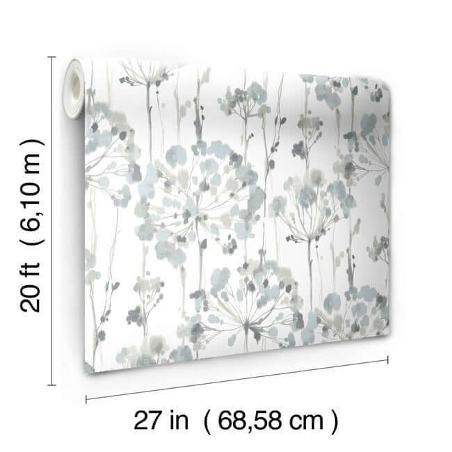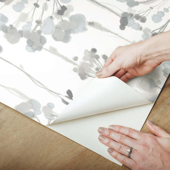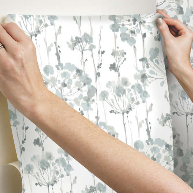 Художественные акварели небесно-голубого и стерлингово-серебряного оттенков придают этой цветовой гамме воздушную лёгкость. Эти полупрозрачные обои с голубым и серым ажурным узором, выполненные по технологии «сними и приклей», имеют ширину 27 дюймов и длину 20 футов, покрывая примерно 45 квадратных футов на рулон.