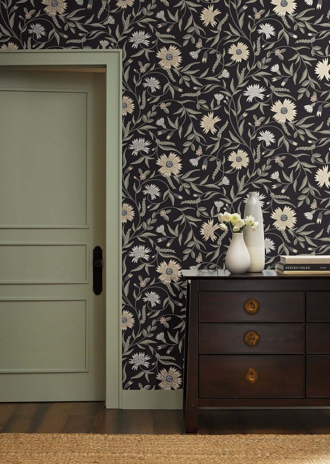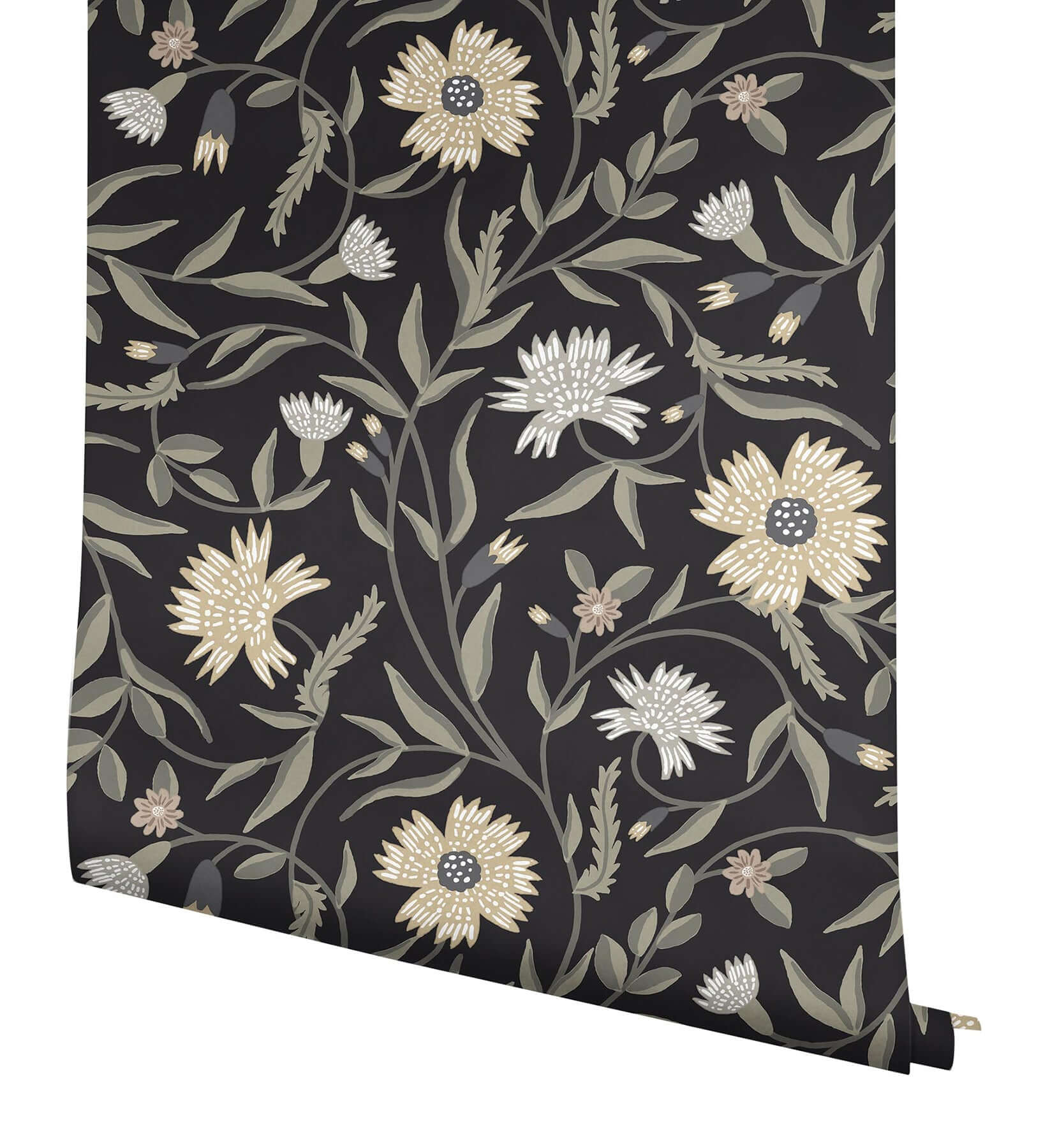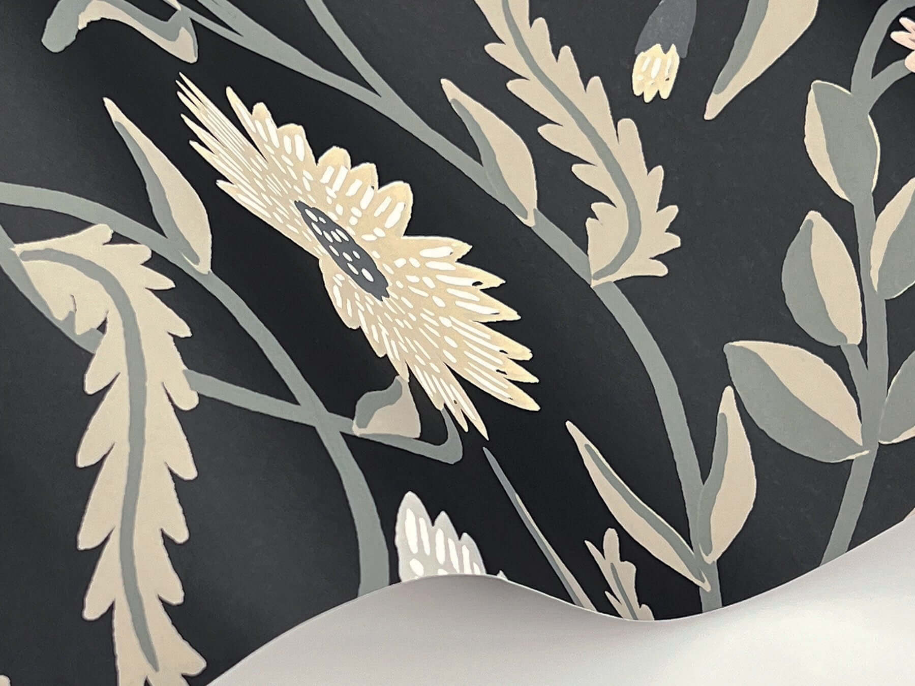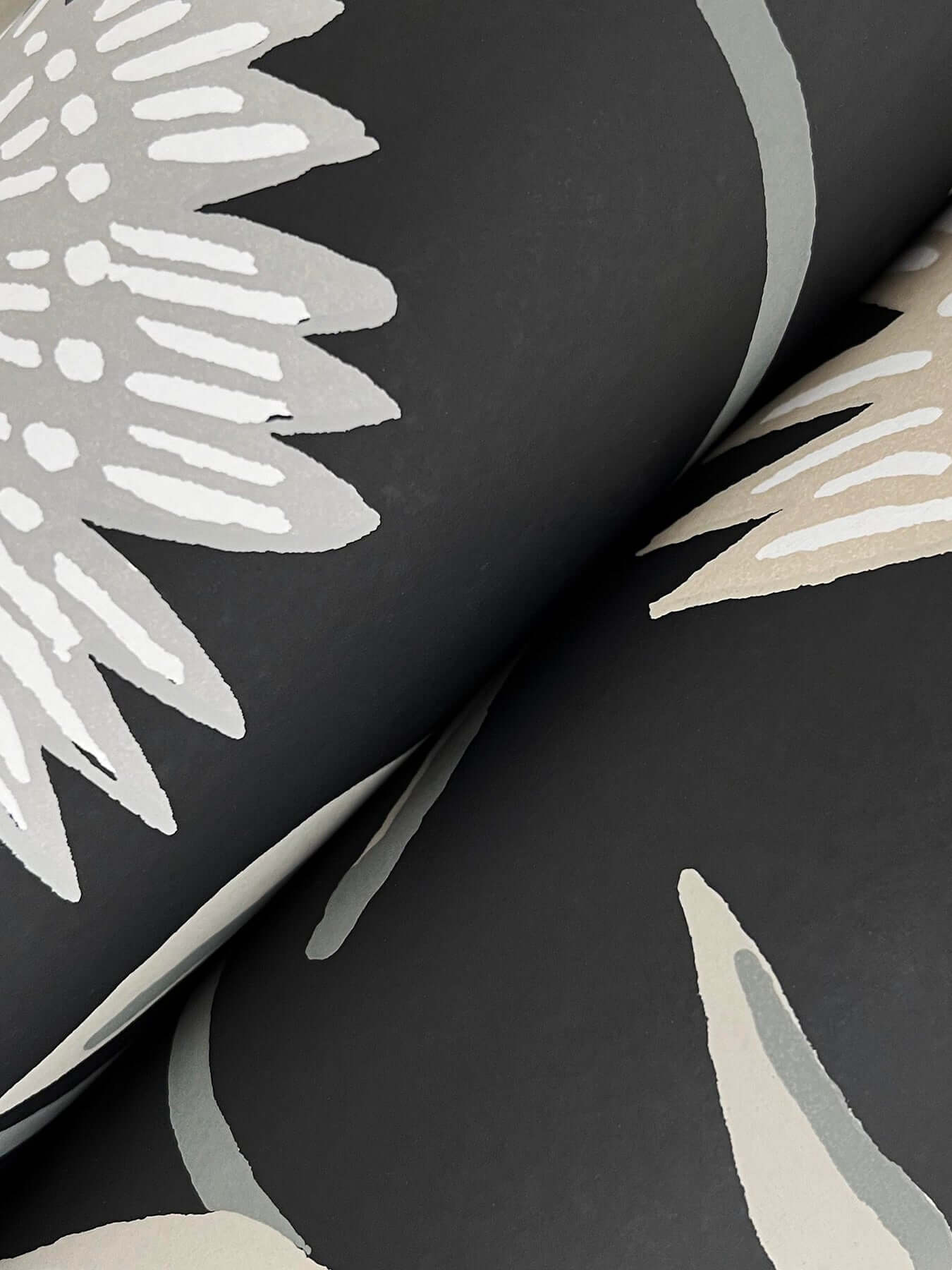 Великолепные стебли и роскошные цветы оживают в крупноформатных обоях Aster от Rifle Paper Co. Изысканная иллюстрация в нейтральных оттенках эффектно контрастирует с глубоким чёрным фоном.