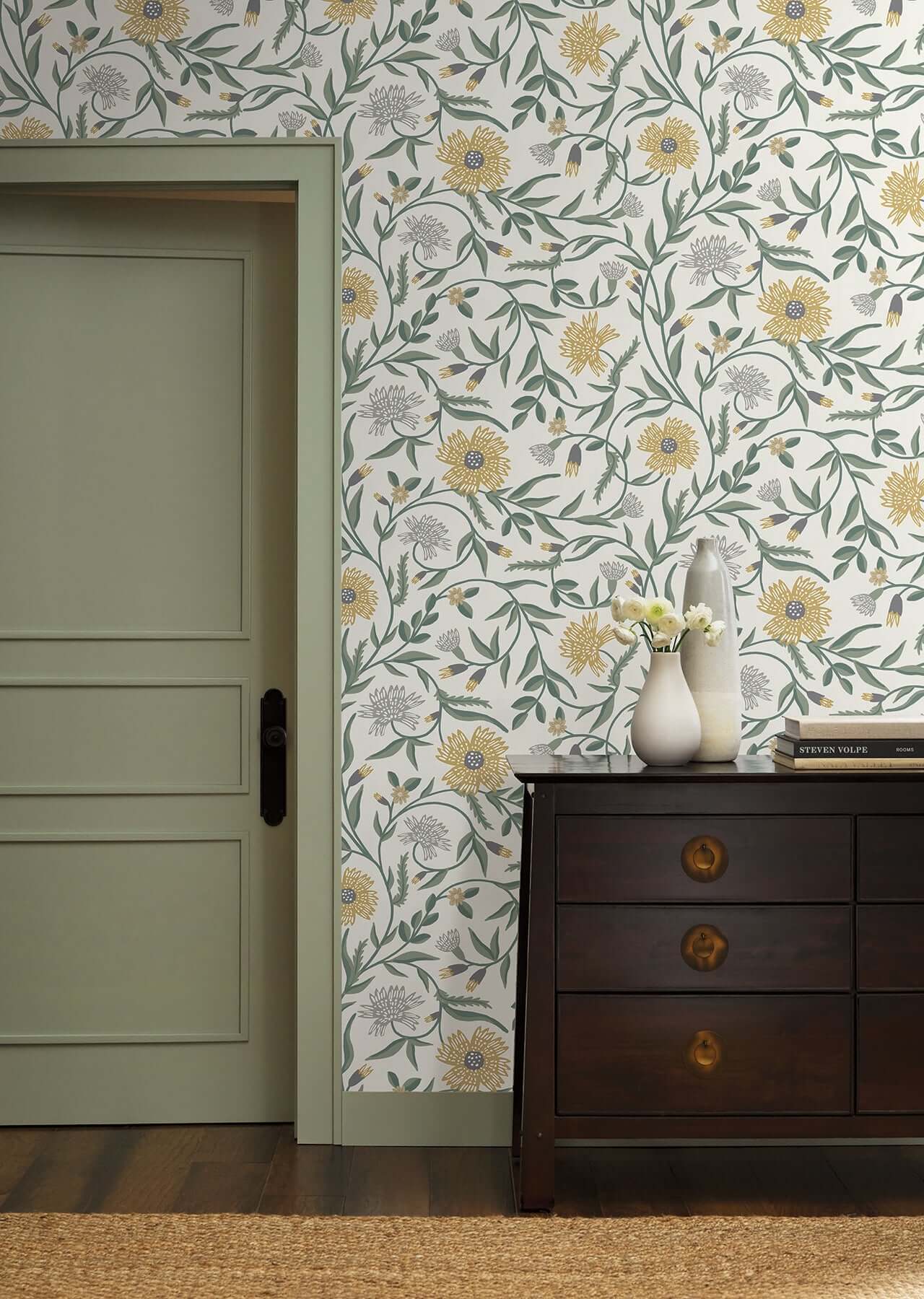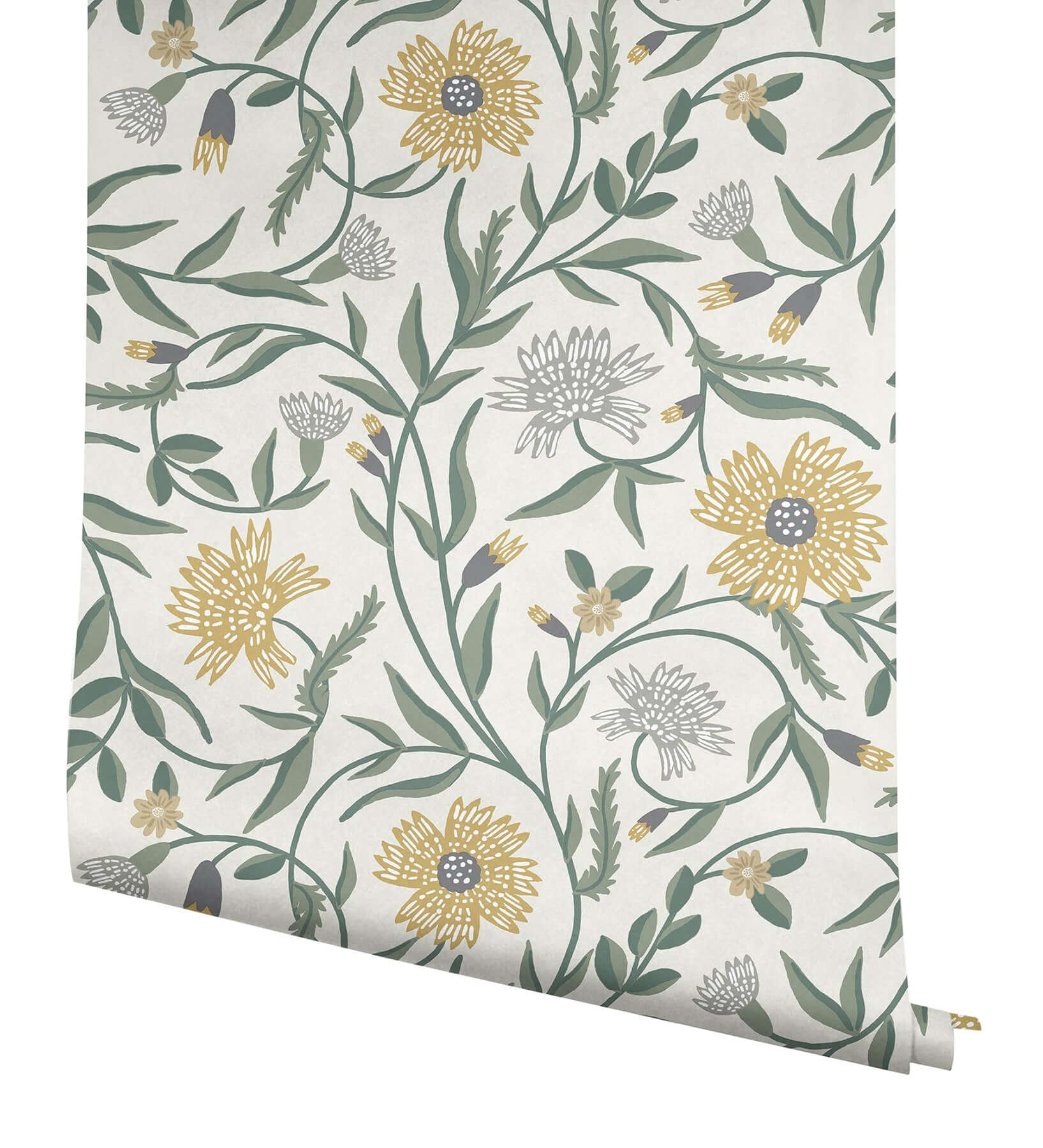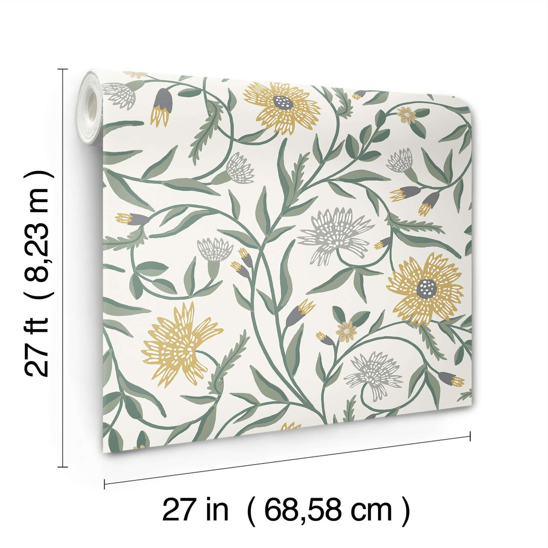 Художественная иллюстрация, выполненная в изысканной палитре желтого, серого и зеленого, оживает на стене, наполняя пространство природной гармонией и изящной графичностью. Каждый рулон, размером примерно 27 дюймов в ширину и 27 футов в длину (площадь покрытия около 60.8 кв. футов), — это возможность создать смелый и детализированный флористический образ.