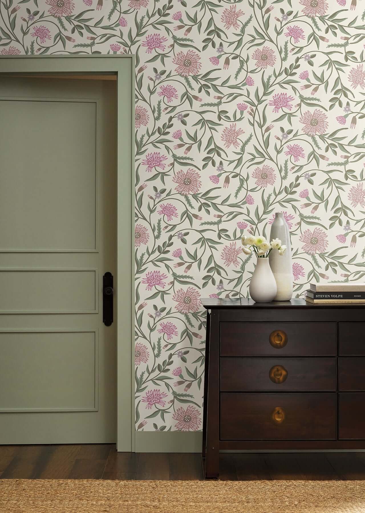 Великолепные стебли и роскошные цветы оживают в крупноформатных обоях Aster от Rifle Paper Co. Изысканная иллюстрация в нежных оттенках розового, мадженты, сирени, зелени и сливочного-белого создает ощущение цветущего сада.