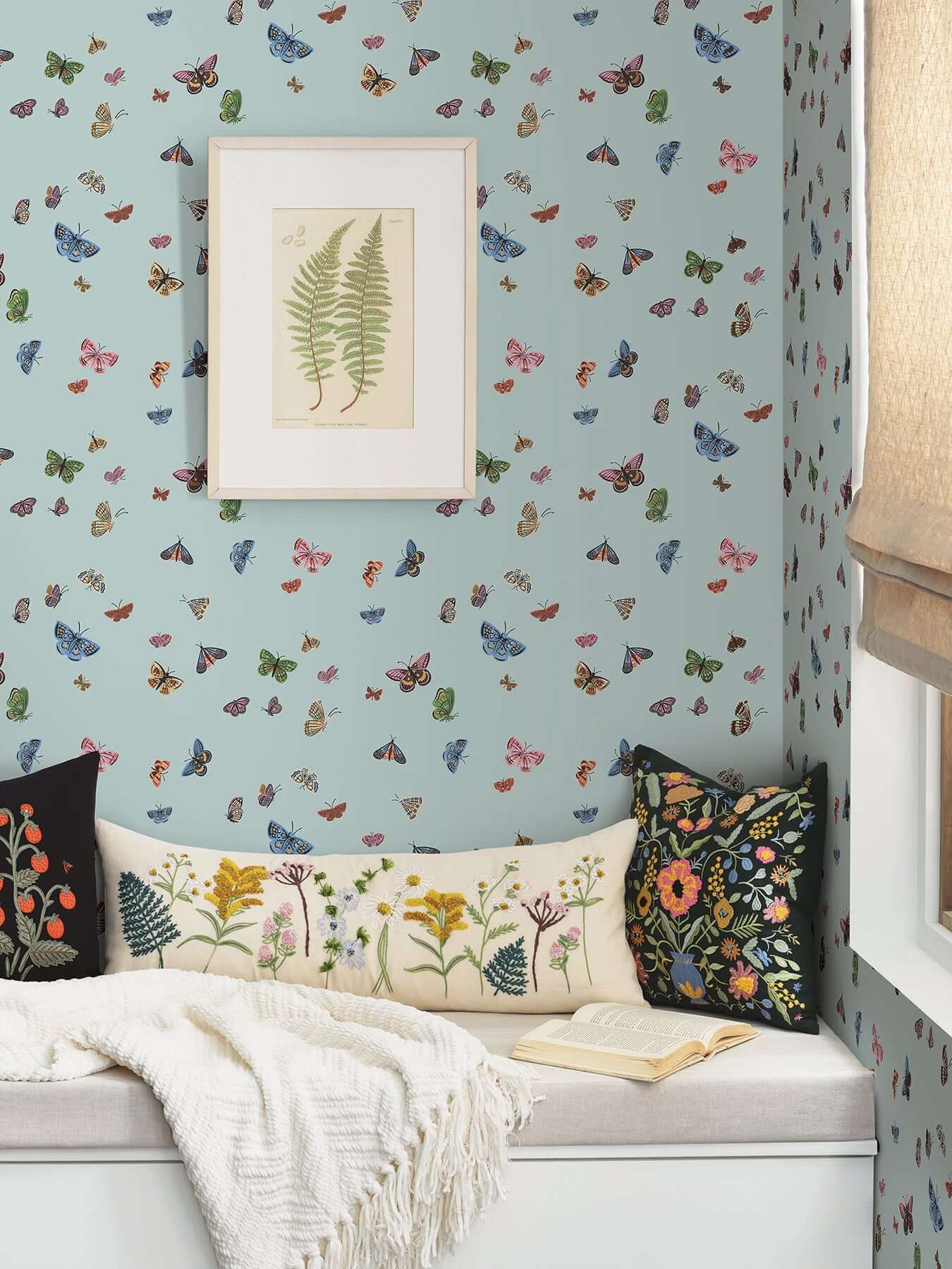 Погрузитесь в волшебный мир, где воздух наполнен изящным танцем крыльев. Обои «Дом бабочек» от Rifle Paper Co. — это очаровательная симфония порхающих бабочек, воплощенная в дизайне невероятной детализации. Каждое насекомое прорисовано с любовью, а их крылья играют радостной палитрой сочных оттенков: нежно-зеленого, розового, алого, лазурного и солнечно-желтого.
