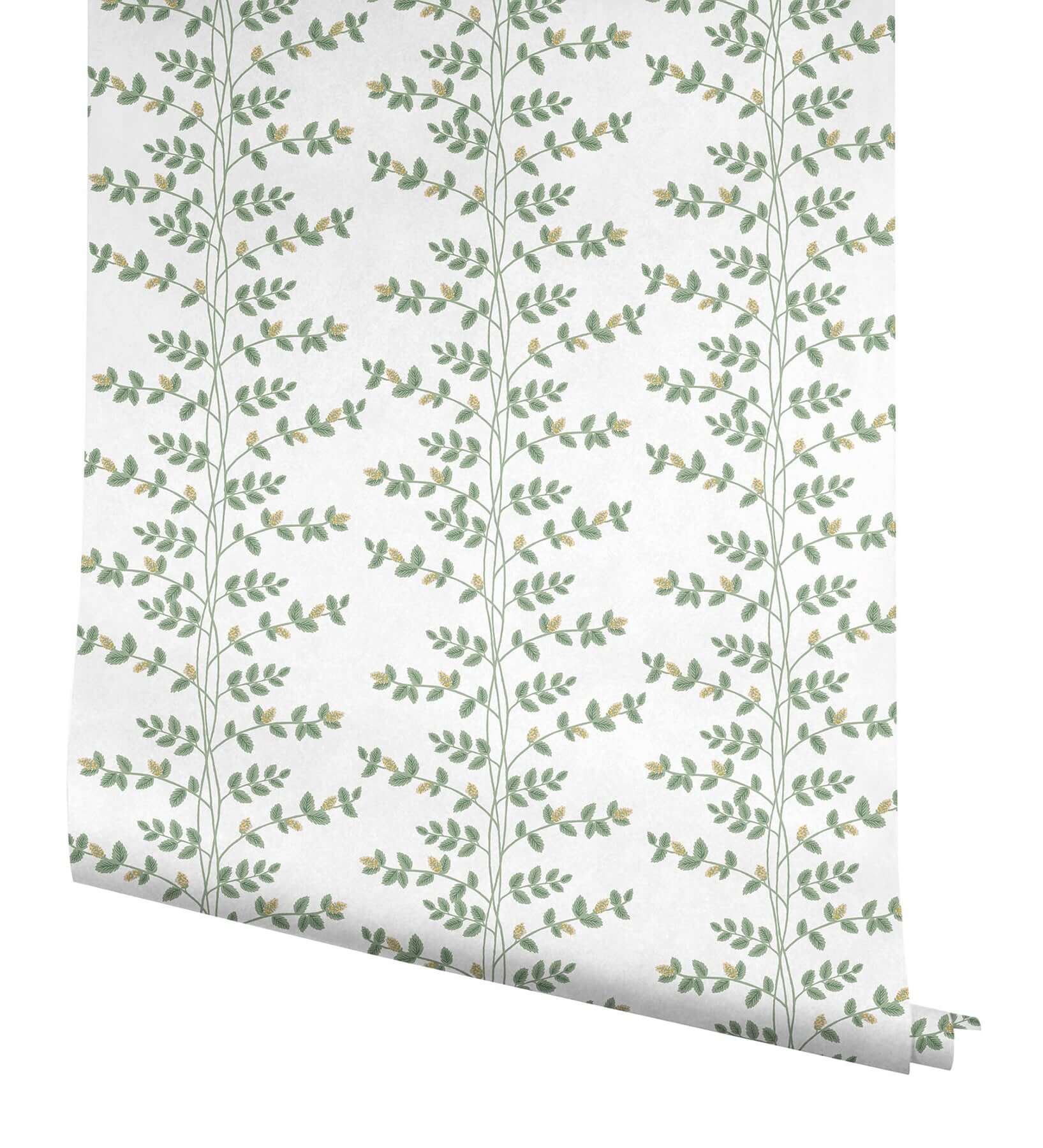 Дизайн «Вьющаяся лоза» — это изящный рисунок нежных листьев, создающий ботаническую интерпретацию вертикальной полоски. Узор дополнен россыпью миниатюрных цветов, выполнен в свежей палитре оттенков зелёного, жёлтого и белого.