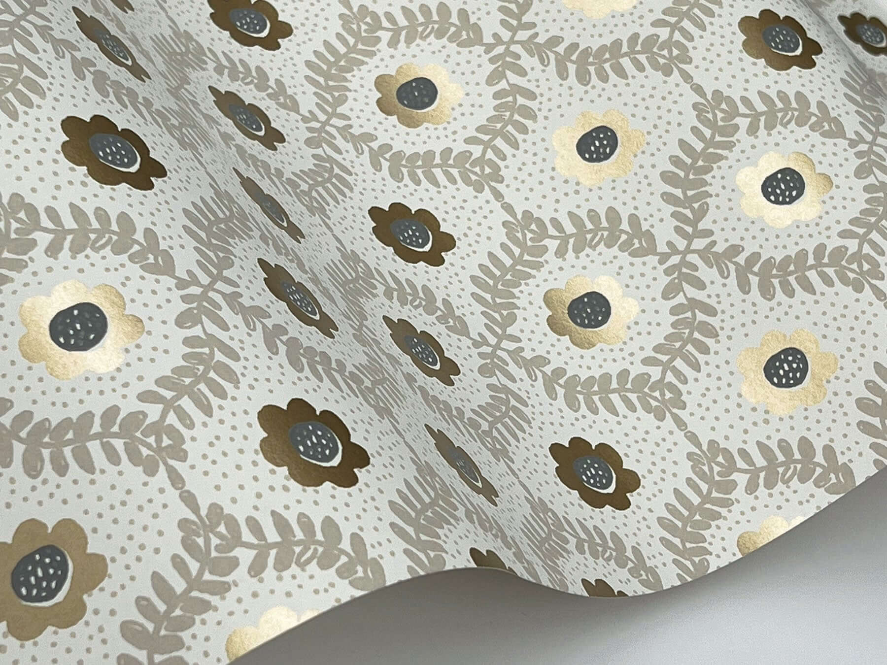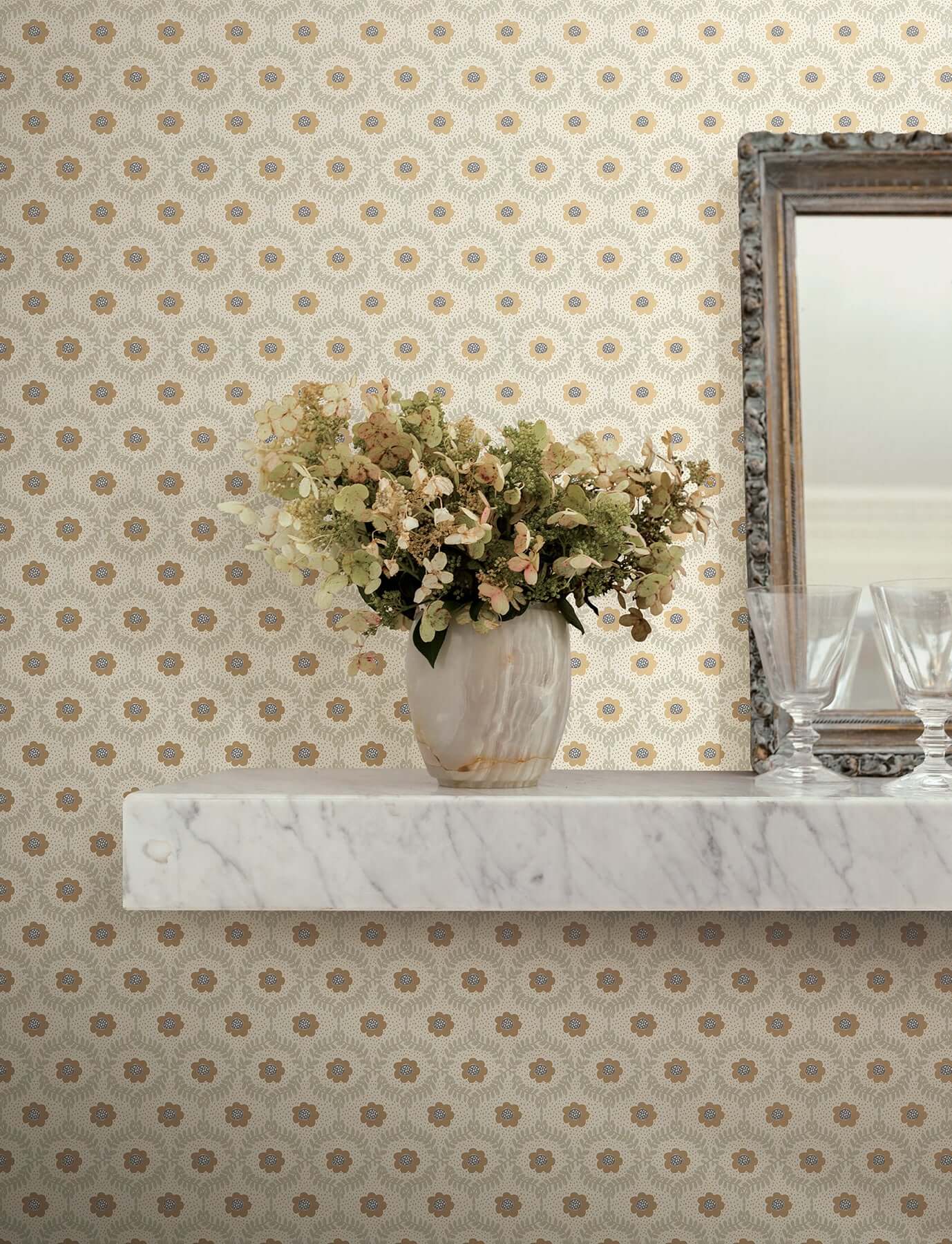 Нежные цветы и изящные листья в обрамлении мерцающих золотых точек — такова фреска Emma от Rifle Paper Co. Иллюстрация, выполненная в теплой палитре мандаринового, бежевого, кремового и золотого, создает атмосферу утонченного сада.