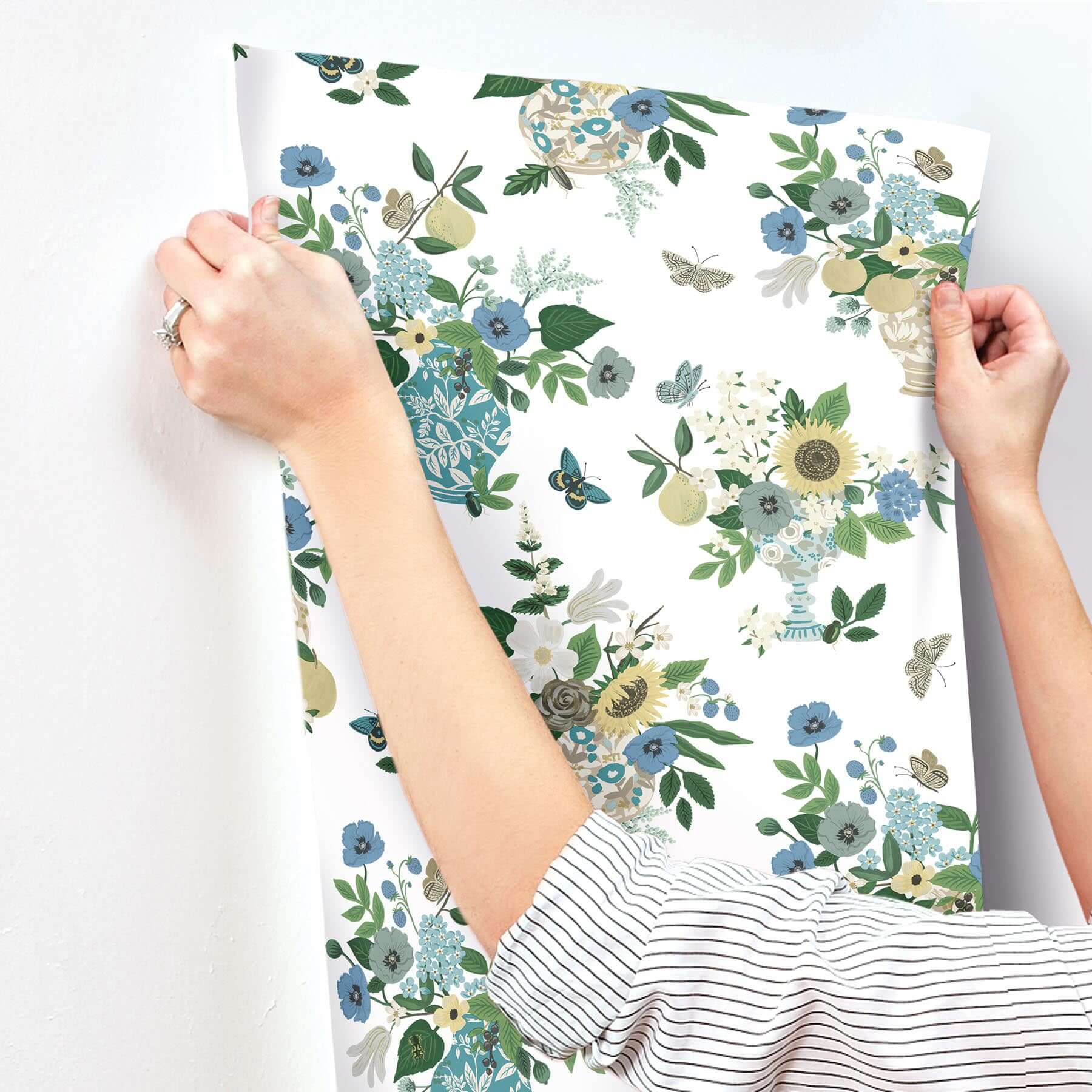 Обои «Flower Studies» от Rifle Paper Co., представленные York Wallcoverings, — это настоящий гимн цветущему саду, застывшему на стене. Роскошные букеты в вазах, написанные вручную, создают ощущение изобилия и нежности, а порхающие бабочки добавляют лёгкости и динамики.