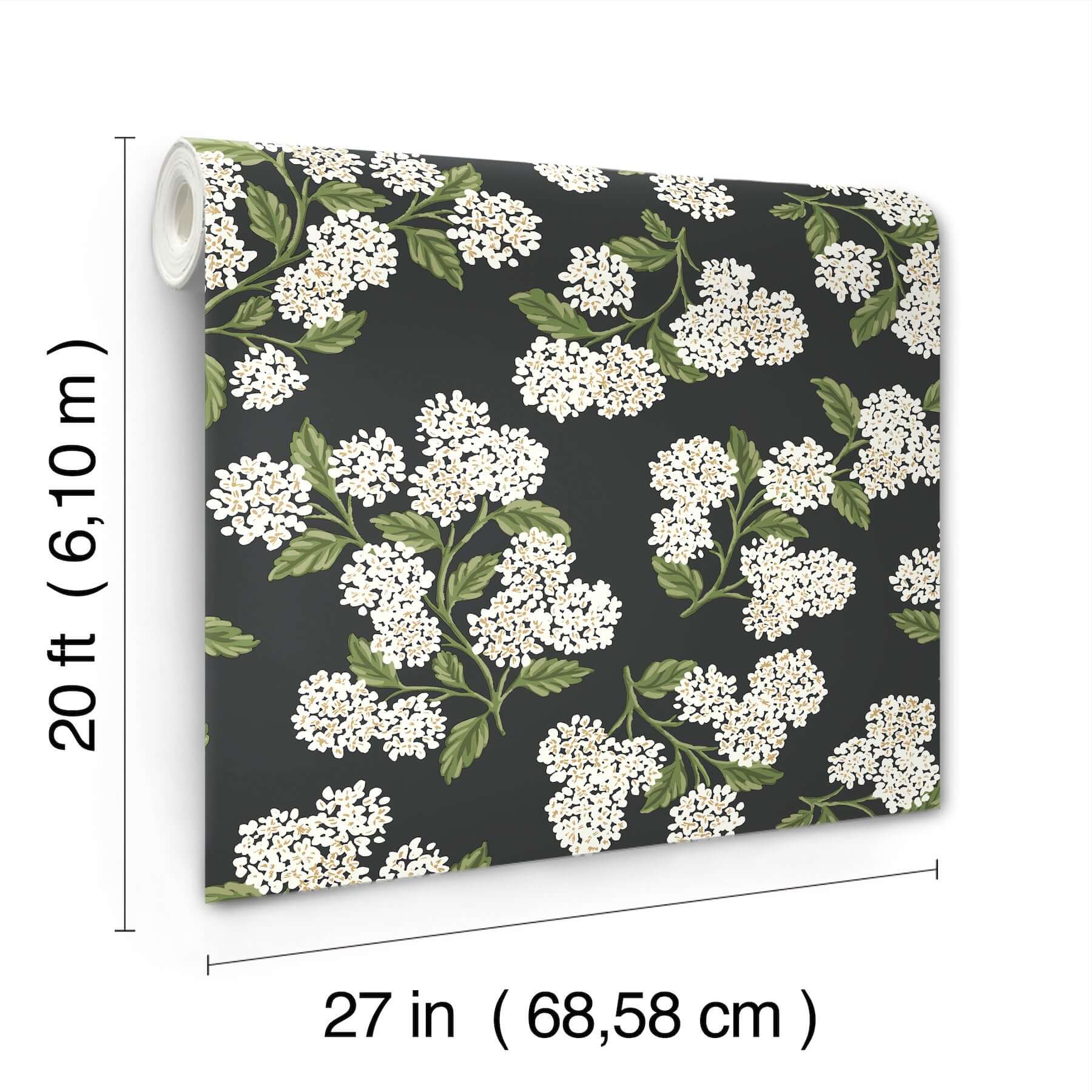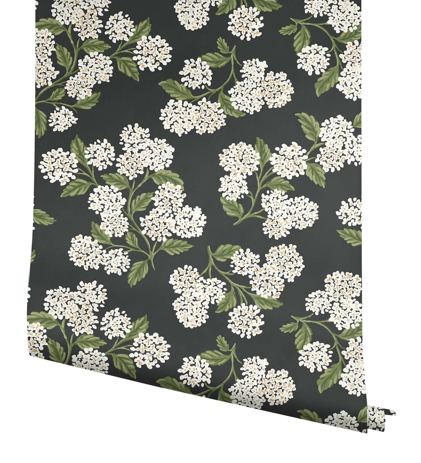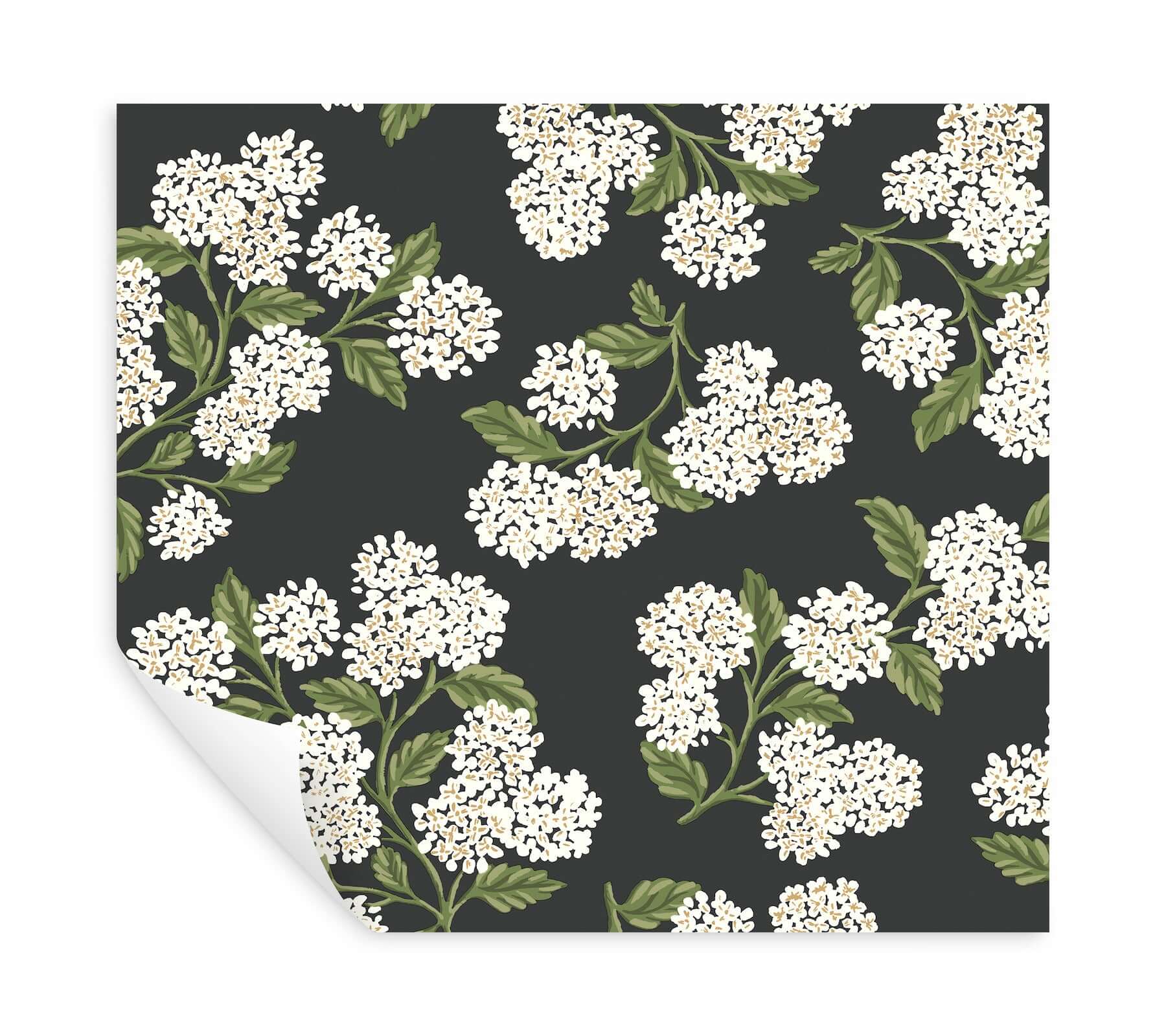 Огромные, роскошные соцветия гортензии от Rifle Paper Co. — это изысканный и утончённый способ привнести смелый цветочный акцент в любое пространство. Нежные белые бутоны с золотистыми сердцевинами и сочной зеленью стеблей эффектно контрастируют на глубоком чёрном фоне, создавая атмосферу драматической элегантности.