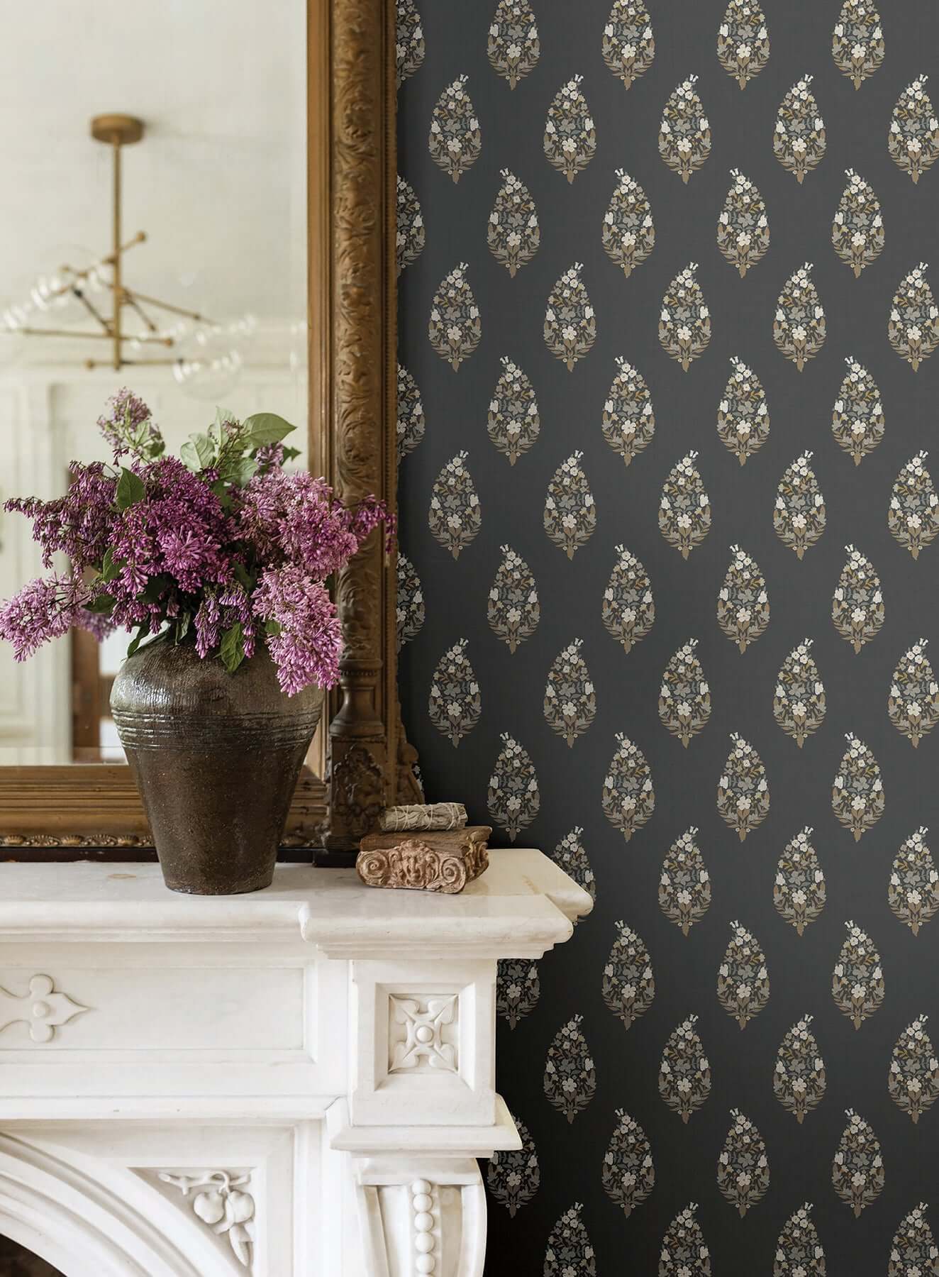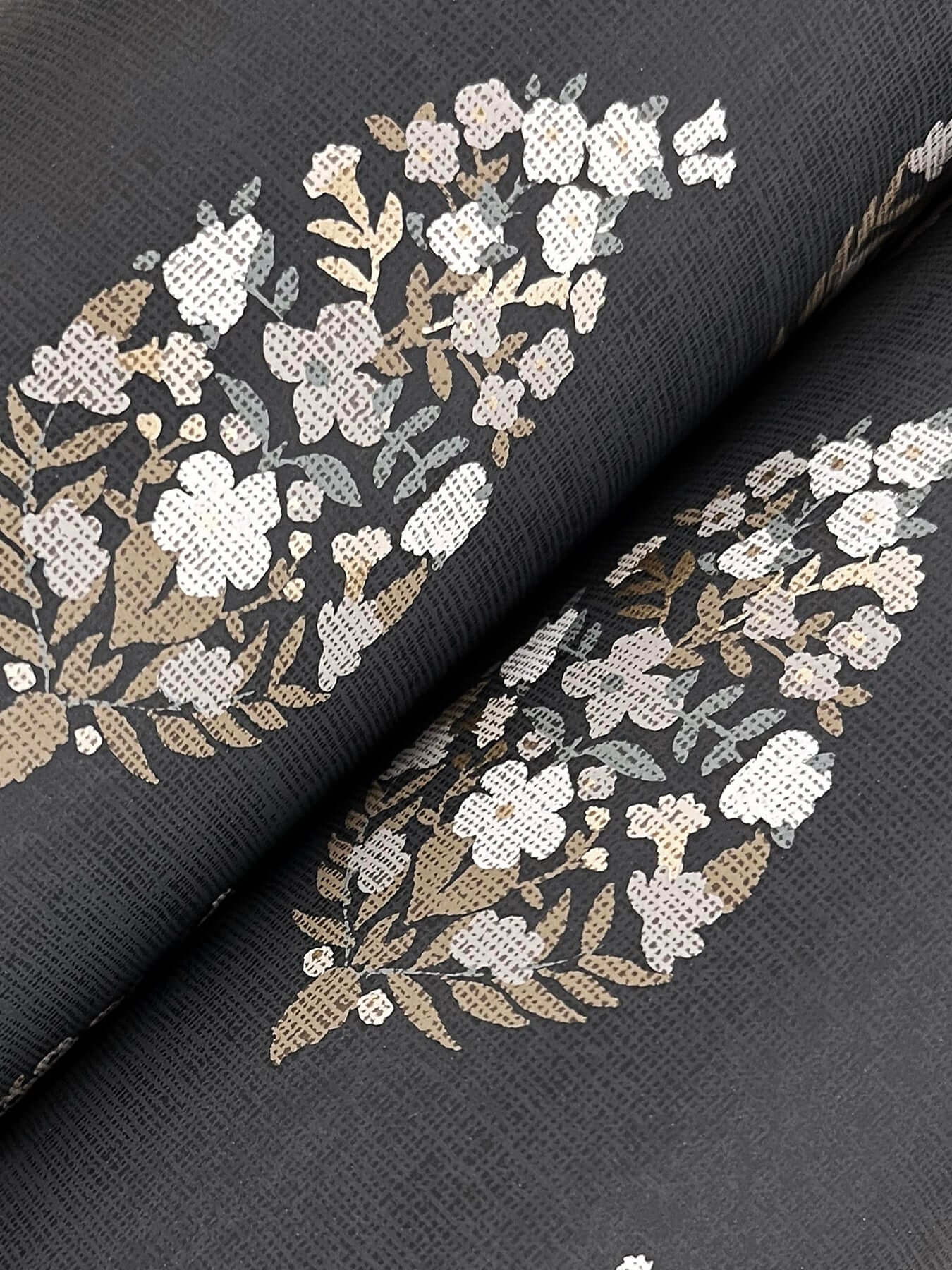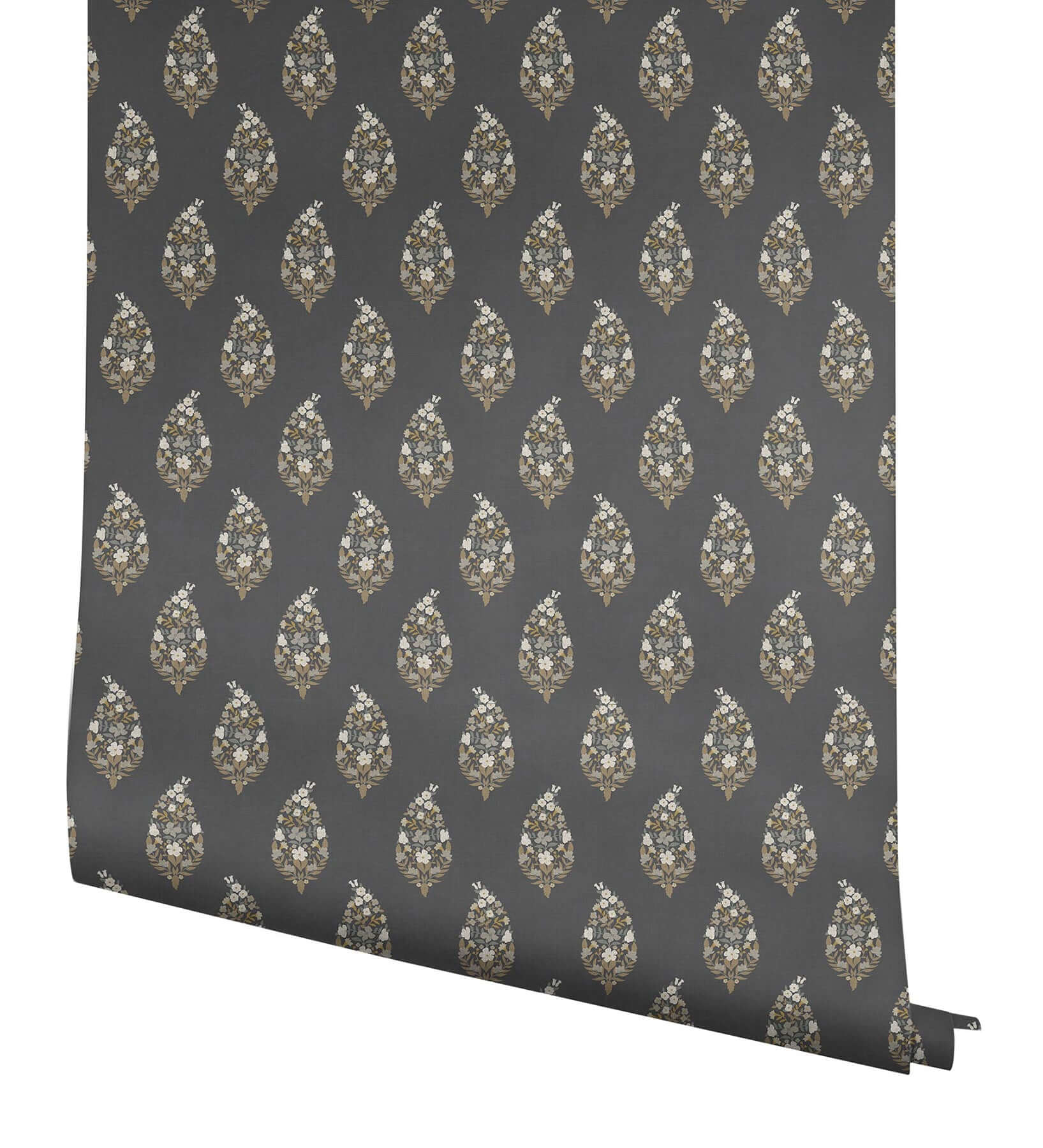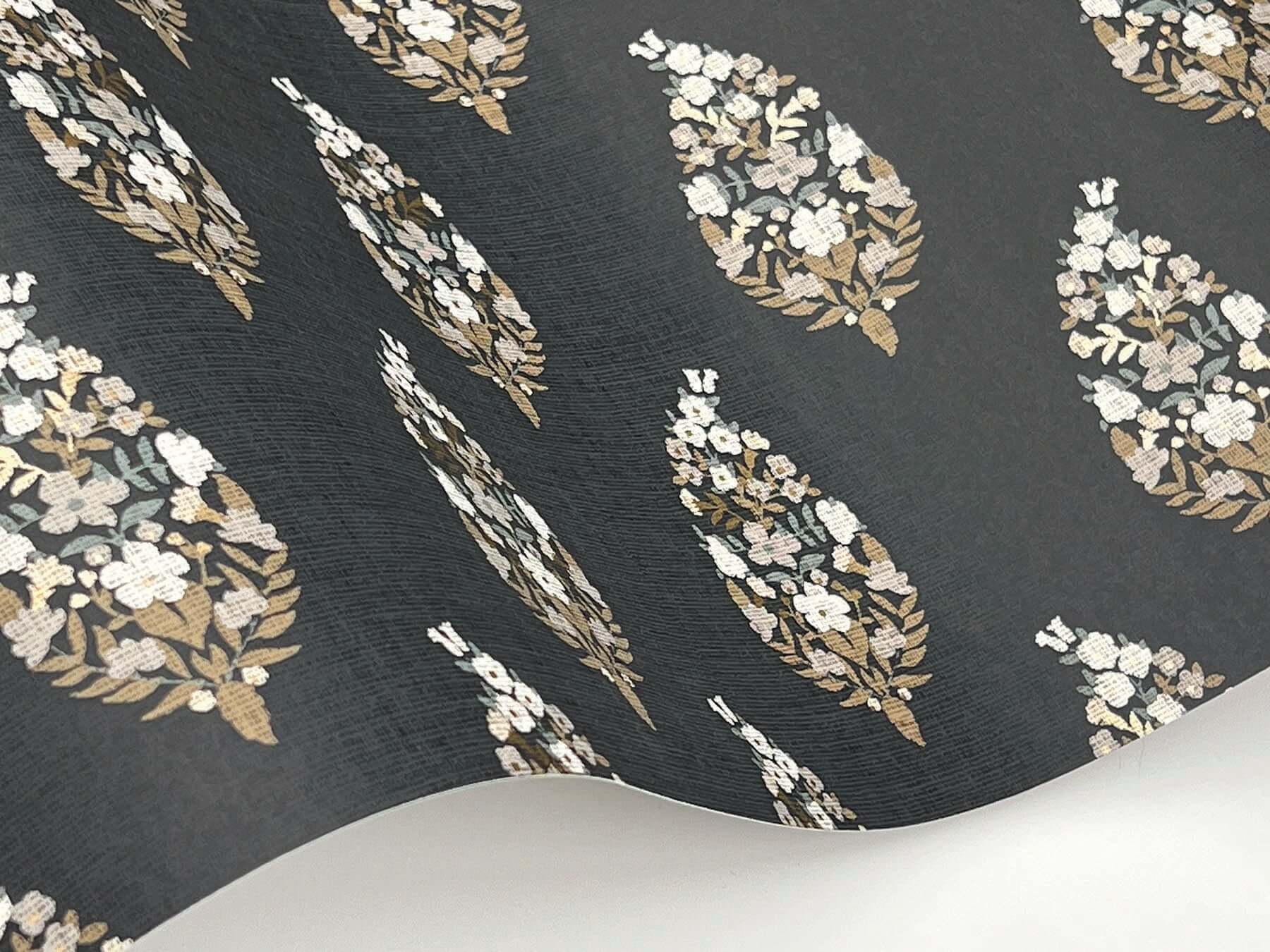 Нежные соцветия и листья складываются в изящные орнаментальные капли в нашей свежей интерпретации классического узора «пейсли». Иллюстрация выполнена в оттенках белого, серого, стального синего, охры и угольного.