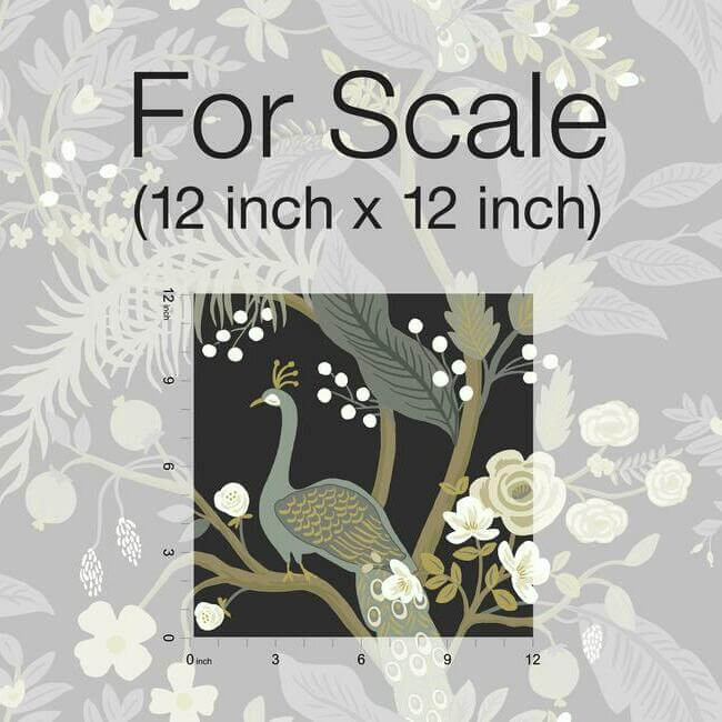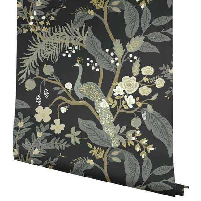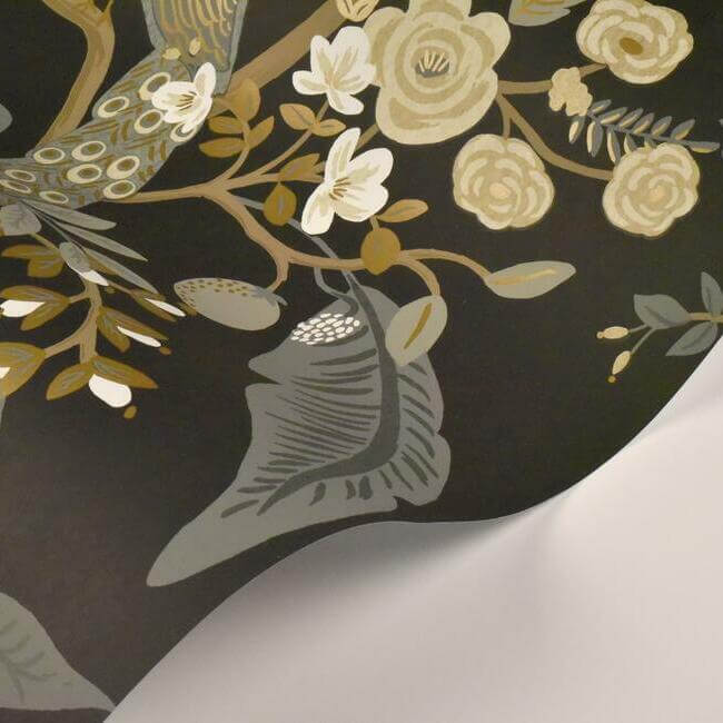 В этом современном прочтении традиционных мотивов шинуазри от Rifle Paper Co. великолепные павлины восседают на извилистых ветвях, окруженные яркими цветами и изумрудной листвой.