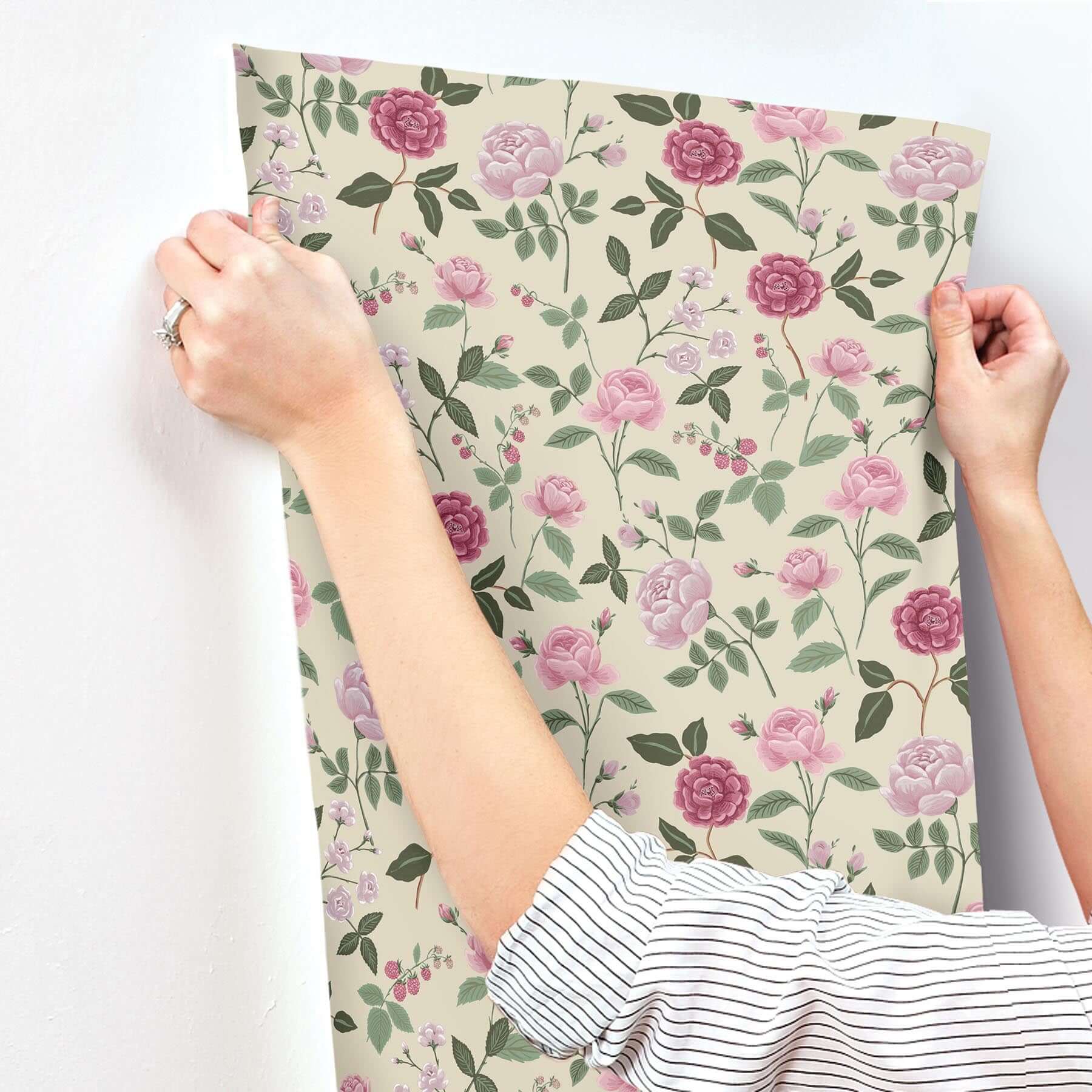 Вдохновлённые старинными ботаническими иллюстрациями, обои «Roses» представляют собой вечный узор, наполненный многослойными деталями, классическими оттенками и игривыми веточками с малиной.