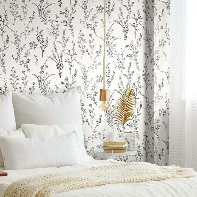С нежной изысканностью, словно только что собранные полевые цветы, рассыпаны по однотонному фону, создавая милый узор, напоминающий бескрайние луга и холмистую сельскую местность. Это обои «Дикие цветы» (Wildflower Sprigs).