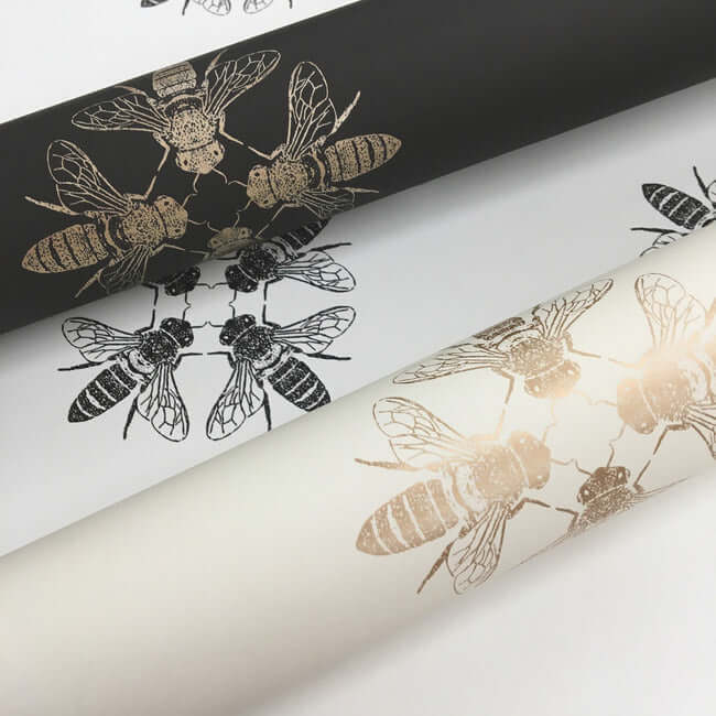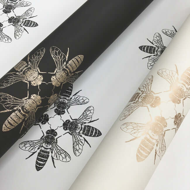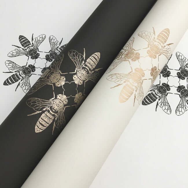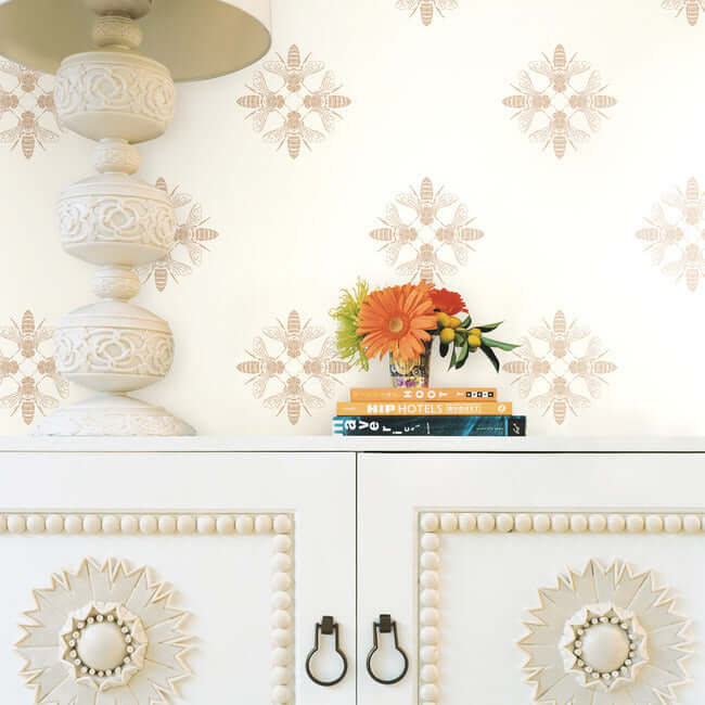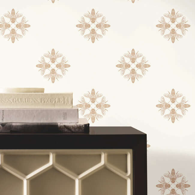 Узор «Медовая пчела» — это изысканный диалог между искусством и природой. Стилизованные пчёлы, выполненные в благородном металлическом оттенке или глубоком чёрном цвете, обращены друг к другу, образуя элегантные ромбовидные медальоны. Этот ритмичный рисунок создаёт на стене утончённую и динамичную графику, наполняя пространство характером и скрытой энергией.