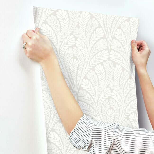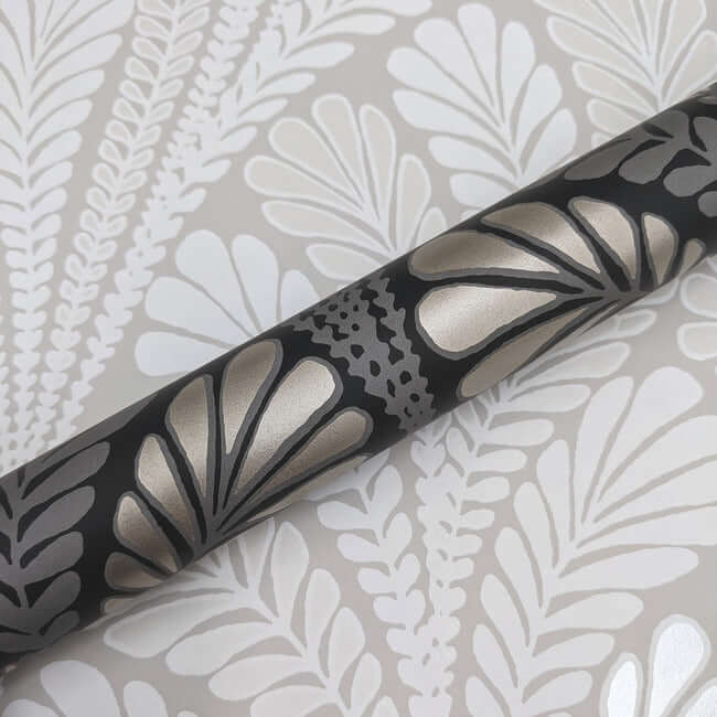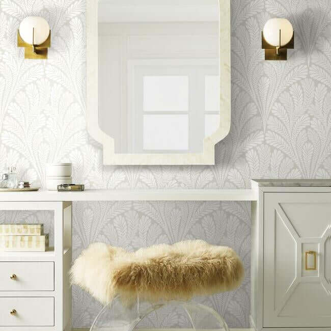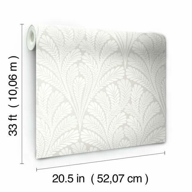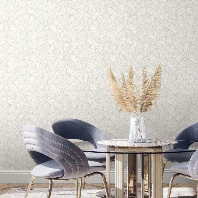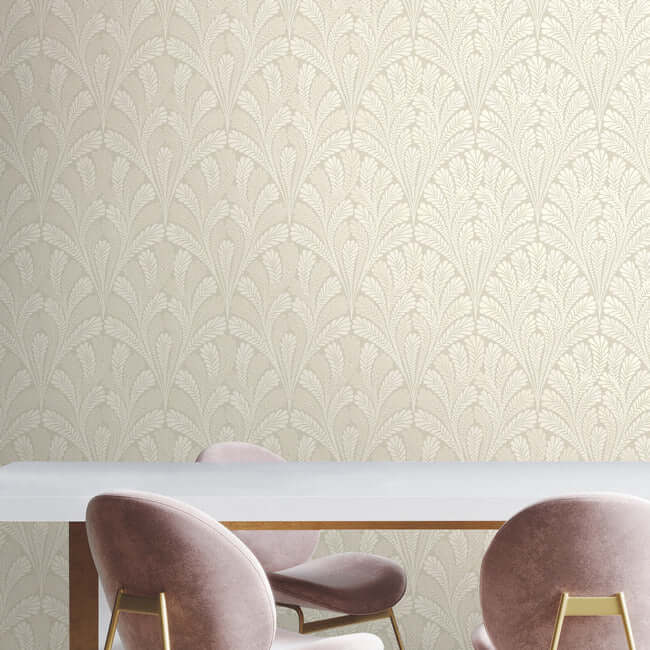 Веерообразные перистые листья создают изящный изгиб узора «Shell Damask», который подчеркнут современными металлическими и перламутровыми акцентами.