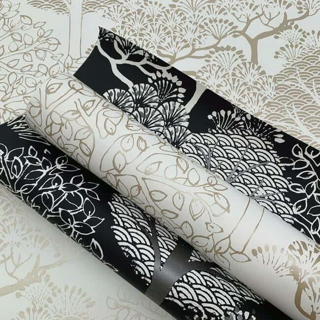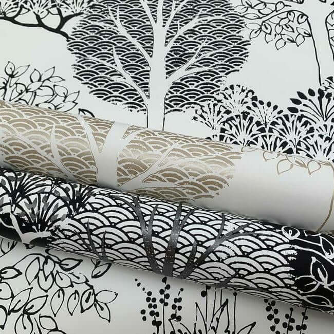 Уникальный лесной узор «Кимоно Деревья», где шелкографические принты подобны листьям, создающим неповторимую красоту. Обои представлены как в благородных матовых, так и в эффектных металлических оттенках.