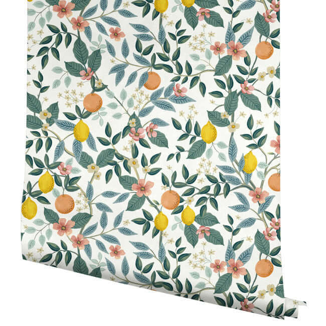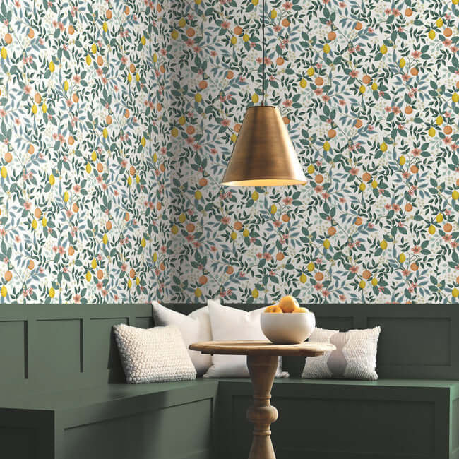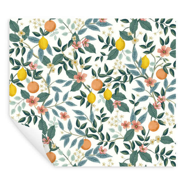Ветви «Цитрусовой рощи» усыпаны спелыми лимонами и апельсинами, украшены нежными цветами. Этот самоклеящийся флизелиновый фрагмент обоев York, созданный по дизайну Rifle Paper Co., — словно окно в солнечный сад.